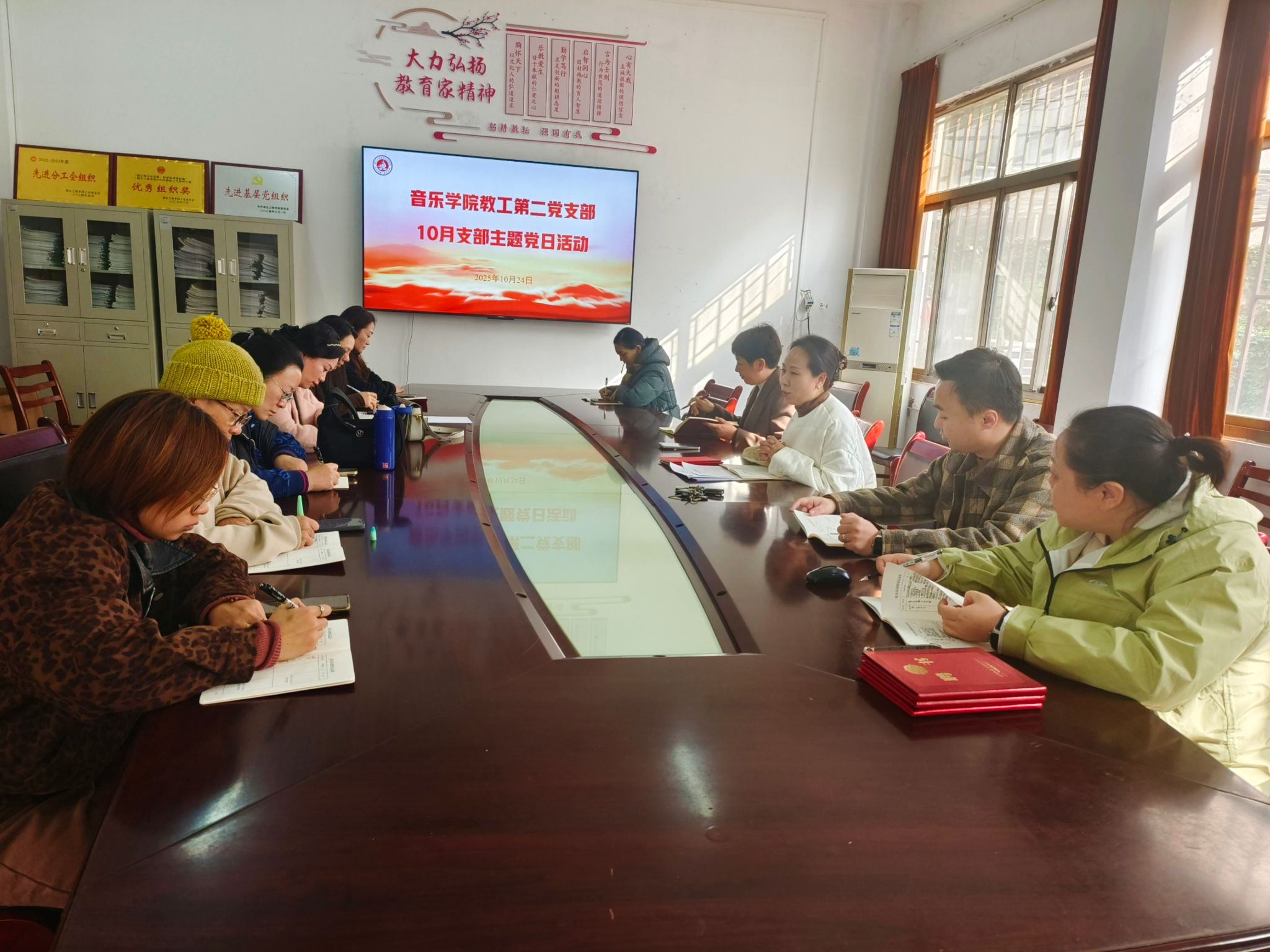 2025年10月24日下午,音乐学院教工第二党支部在院党员活动室开展了10月份支部主题党日活动,会议由党支部书记王晶晶主持。